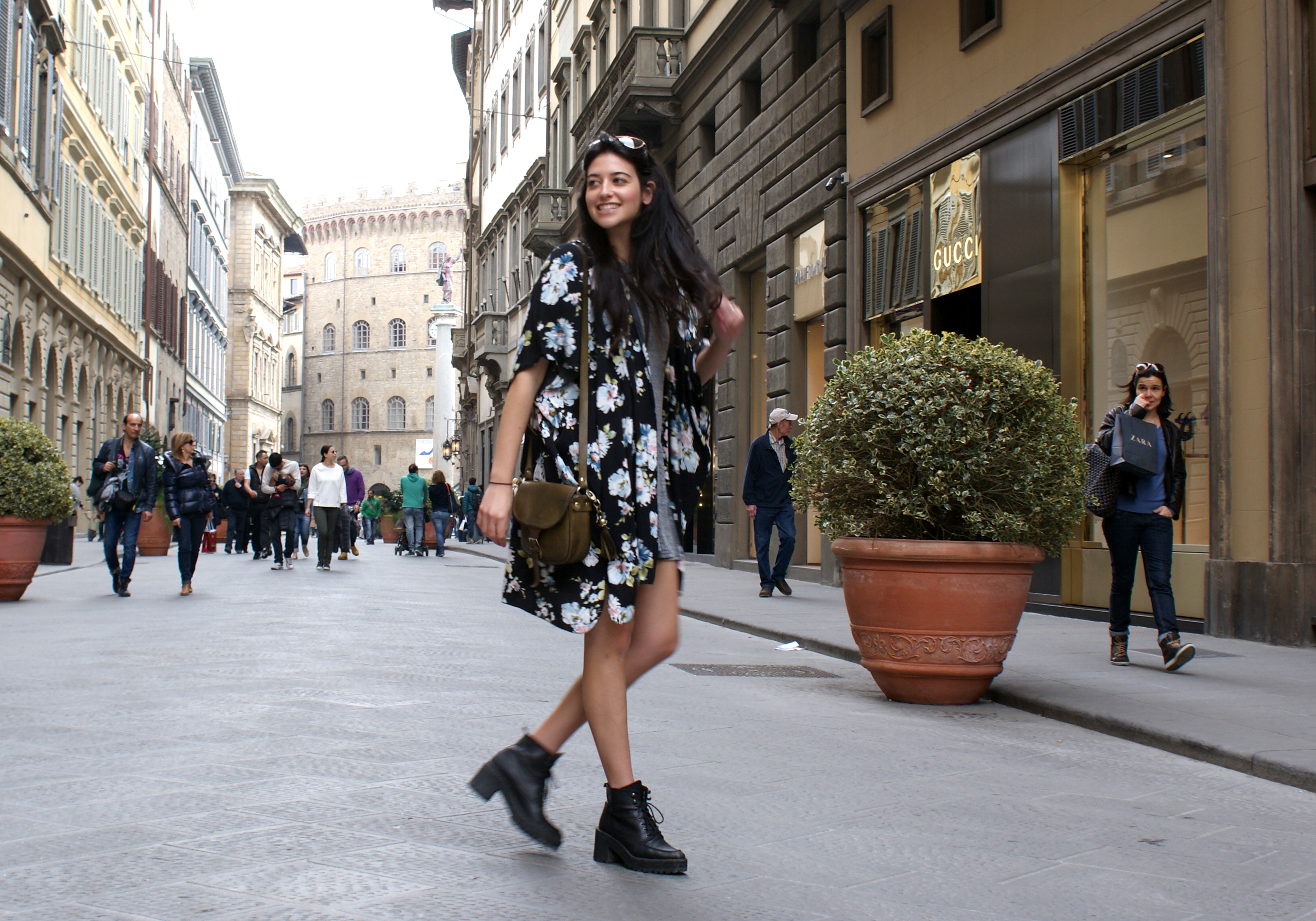 Fantastico questo completo indossato dalla Californiana Marila Lombrozo, un mini dress in jersey di cotone abbinato ad uno spolverino a fantasia floreale su sfondo nero dai colori che riprendono il Verde Oliva della Catana piccola con ciondolo, bellissimi gli scarponcini stringati!