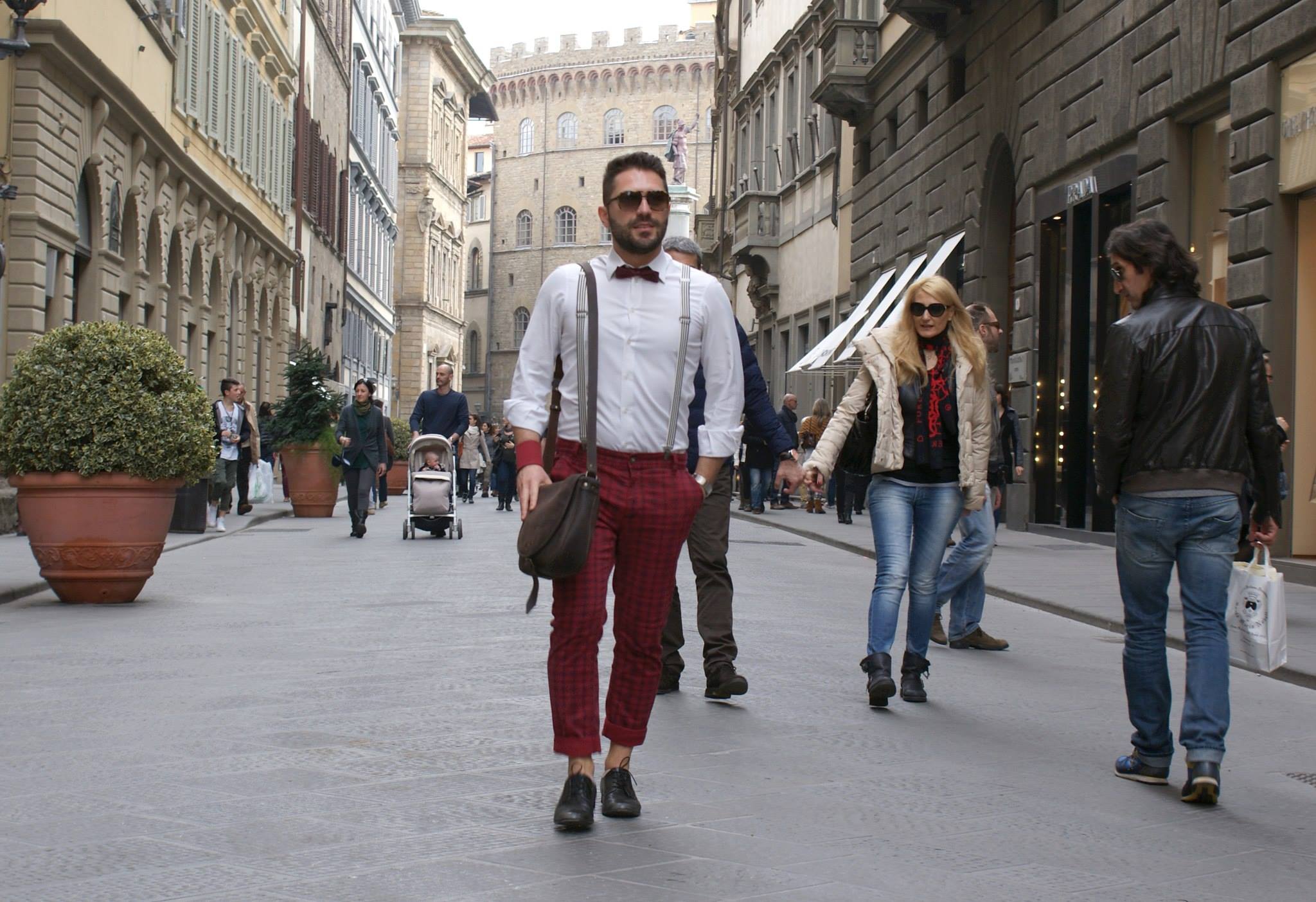 Sempre in Via Tornabuoni, Gerado Camerota porta a spalla la richiestissima Catana Modello Vintage in Nabuk colore Coconut. Questo look assolutamente Hipster è composto da una semplice camicia bianca sovrapposta ai pantaloni a quadri in sfumature di rosso con svolta alla caviglia, sostenuti dalle bretelle rigate, originalissimo il papion in tono con i pantaloni, completano l’outfit le stringate nere.